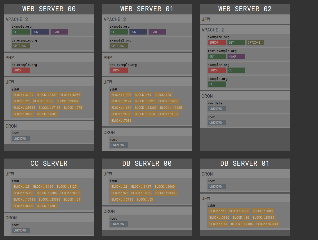 # Overwatch A simple real time NodeJS based visual multi-server syslog analyser ## Supported Services - Apache2 - Cron - PHP - UFW - MySQL Want to see another service supported just raise an issue. ## Screen Shot